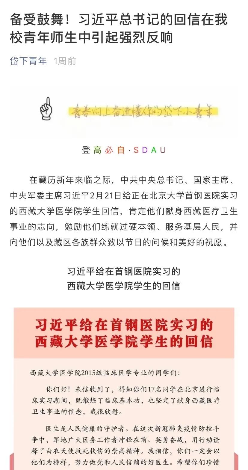 通过校团委微信公众号发布疫情实时动态和自我防护指南,加强对疫情防控的宣传引导;号召团干部和团员青年学习习近平总书记给在首钢医院实习的西藏大学医学院学生的回信;制作“抗疫必胜·团徽闪亮”系列文化产品,宣传展示学校各级团组织、团干部、广大团员青年在疫情防控工作中的责任担当;开展“同心同根·青春战‘疫’”网络主题作品征集活动,号召团员青年致敬“逆行者”,传递战疫信心;依托团省委“青鸟计划”平台发布线上就业岗位信息,让青年学生放假不放松,实时获得就业资讯,度过一个充实踏实的寒假。截至目前,校团委微信公众号共发布疫情防控相关推送70余篇。