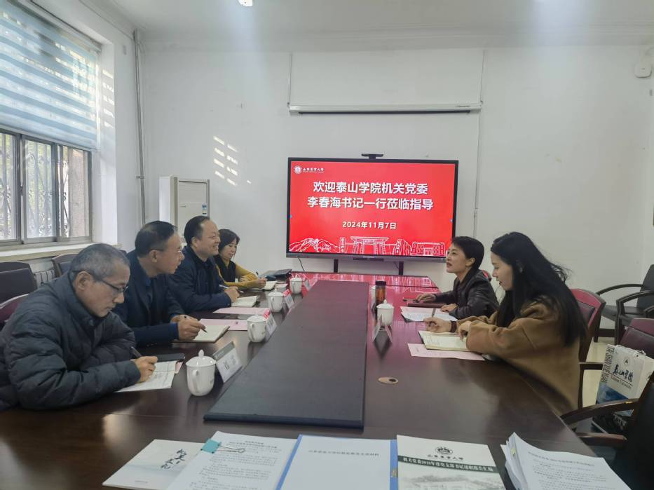 11月7日,泰山学院机关党委书记李春海,组织部正处级组织员安其心等一行4人来校考察交流。交流座谈会在行远楼第四会议室召开,机关党委书记李萍主持会议。