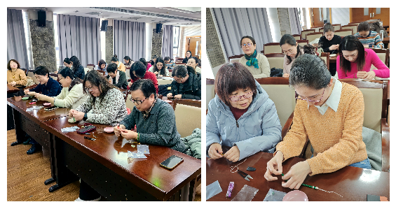 秦梅老师认真为大家讲解玉石文化知识、手串制作步骤、注意事项等,并耐心细致地手把手传授手工串珠技巧。大家现场感悟玉石文化,躬身践行手作文化,感觉收获满满,活动现场洋溢着节日欢乐的氛围。