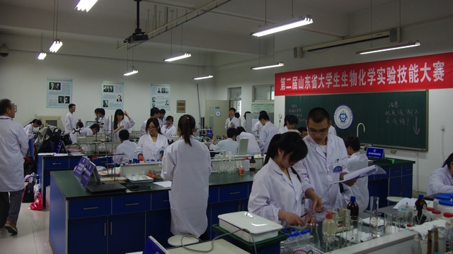 第二届山东省大学生生物化学实验技能大赛,以“探索生命奥妙、勇攀科学高峰”为主题,以“培养创新意识、提升创新能力”为主线,得到了省内外各高校和学生的热切关注,预赛阶段共有省内外17所高校231份作品参赛,经大赛组委会组织专家进行认真评审,选拔出30件作品进入决赛环节。来自省内14所本科院校、30支优秀队伍、100多名选手在决赛中切磋技艺、比拼高下、角逐雌雄。各位参赛选手精心设计、认真准备、规范操作、深刻总结。评审专家组的成员认真观察选手操作的每个过程和细节,详尽评议每组选手的结论和报告,坚持重过程与重结果的有机统一、重规范与重创新的无缝对接。现场实验结束后,专家组逐一对每组选手的实验过程、实验结果提出了相关质疑,进一步考核选手的基本功和创新能力、应变能力。