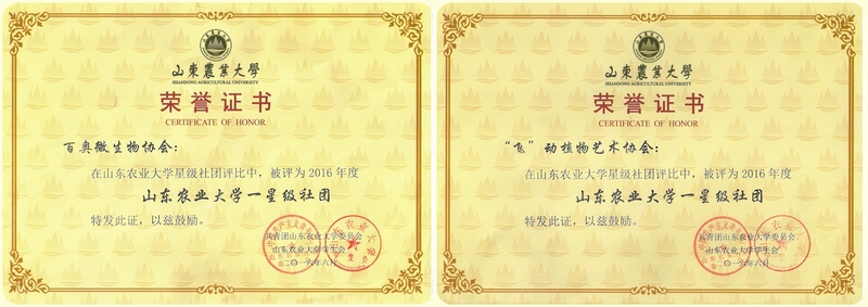 近日,生科院“飞”动植物艺术协会和百奥微生物科技协会在学校年度星级社团评选活动中双双荣获山东农业大学一星级社团荣誉称号。