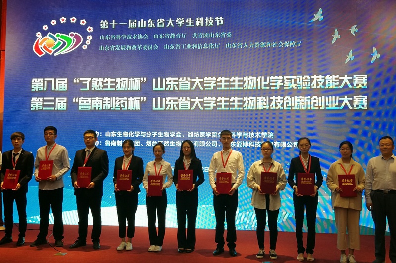5月31日-6月1日,第八届“了然生物杯”山东省大学生生物化学实验技能大赛暨第三届山东省“鲁南制药杯”大学生生物科技创新创业大赛在潍坊医学院浮烟山校区举行。本次比赛是2019年度山东省大学生科技节的重要内容之一,由山东省科协、省教育厅、团省委、省发改委、省经信委、省人社厅主办,山东生物化学与分子生物学会、潍坊医学院生物科学与技术学院承办。来自山东大学、山东师范大学、山东农业大学等省内32所高校、39支代表队的500余名师生参加。经大赛评委公正严谨评判,共评选出实验技能大赛一等奖48项,科技创新创业大赛一等奖49项。
