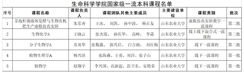 本次进入国家级一流本科课程分别为虚拟仿真实验教学一流课程——芽孢杆菌液体发酵与生物有机肥生产虚拟仿真实验(负责人:朱常香);线上线下混合式一流课程——生物化学 A(负责人:王晓云);线下一流课程——分子生物学 A(负责人:苏英华)。