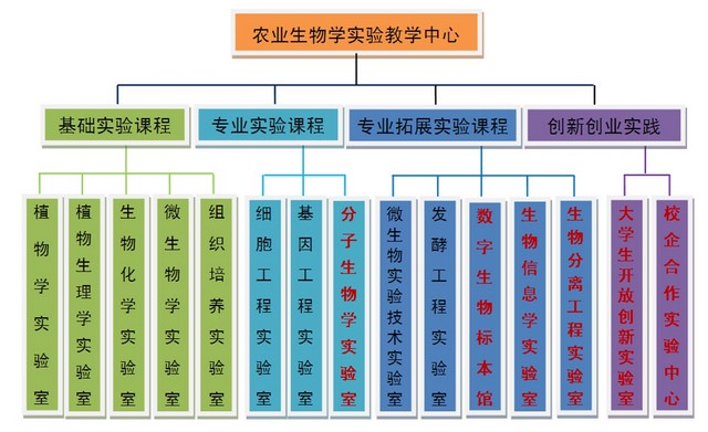 中心根据实验内容,设置13个功能实验室和校内外实践教学基地,完成基础生物学实验、农业生物学实验、现代生物技术实验和农业生产实践四个层次的实验教学任务。前三个层次的实验教学任务分别由三位副主任负责组织协调,农业生产实践基地建设分别由每个本科专业的专业负责人负责组织建设、日常管理和任务落实。