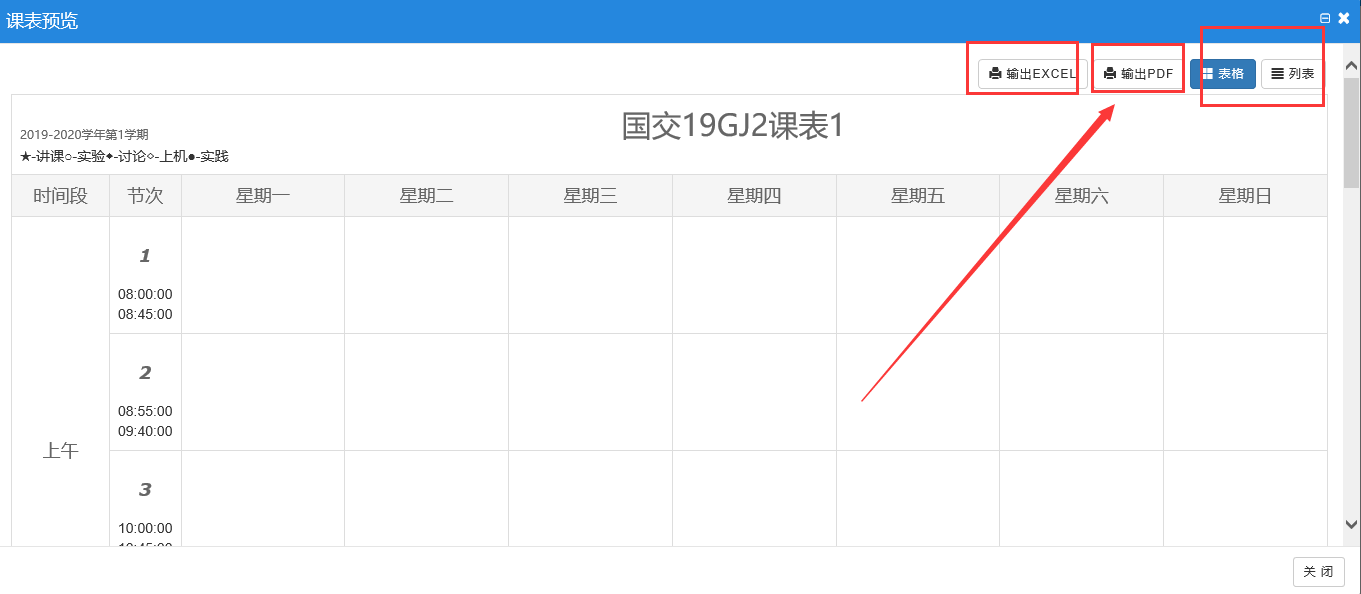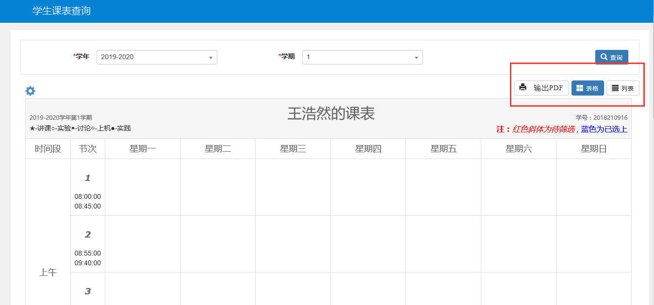 个人课表可以输出PDF,查看时可以按表格或者列表的模式。