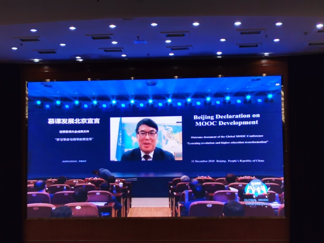 中国教育部部长陈宝生作主旨报告,分享了中国慕课与在线教育的实践、创新与探索。陈宝生指出,在全球教育创新的实践中,慕课正在成为推动高等教育变革的重要引擎,不仅助力中国高校成功应对了疫情危机,而且为今后建设全民终身学习的高质量教育体系积累了宝贵经验。他表示,经过8年的努力,中国慕课数量和应用规模已居世界第一。目前已逐步建立独具特色的发展模式、科学合理的课程标准和共建共享的开放合作机制,探索形成了坚持质量为王、公平为要、学生中心、教师主体、开放共享、合作共赢等六大宝贵经验。