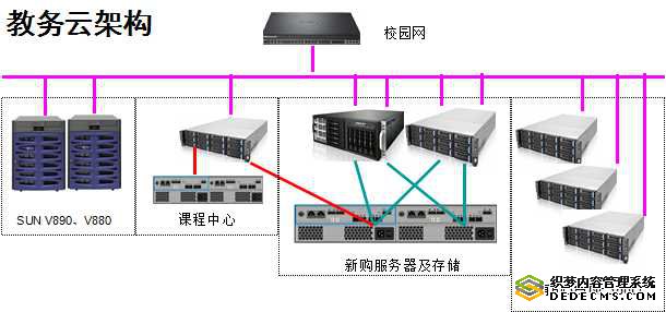原有课程中心使用的IBM服务器及存储设备保持架构及功能不变,在IBM服务器上安装一块8GB FC卡连接新的存储,加入教务云。