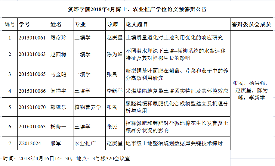 资环学院2018年4月博士、农业推广学位论文预答辩公告