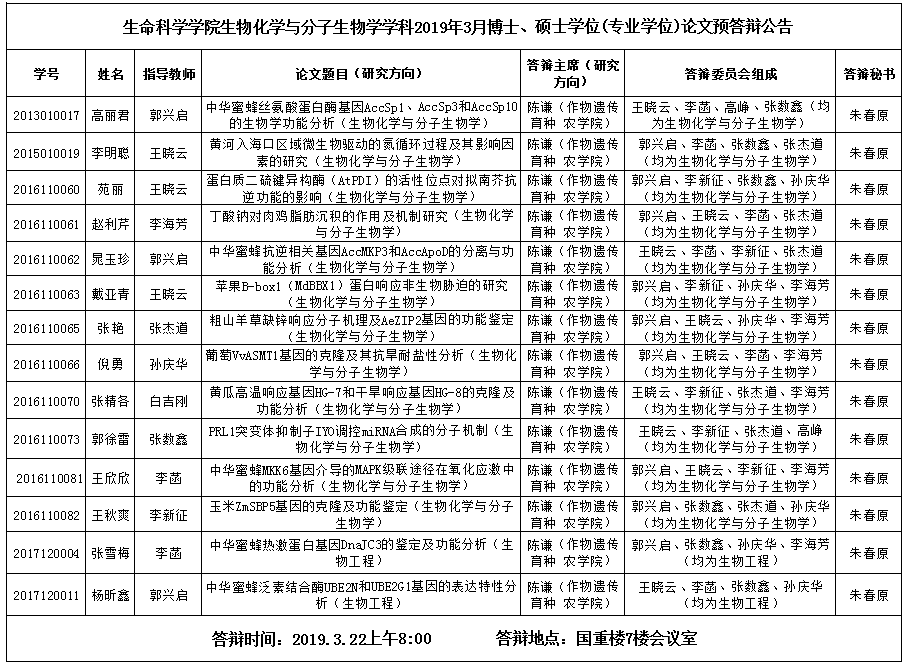 生命科学学院生物化学与分子生物学学科2019年3月博士、硕士学位(专业学位)论文预答辩公告1