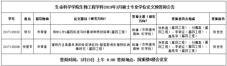 生命科学学院生物工程学科2019年3月硕士专业学位论文预答辩公告3
