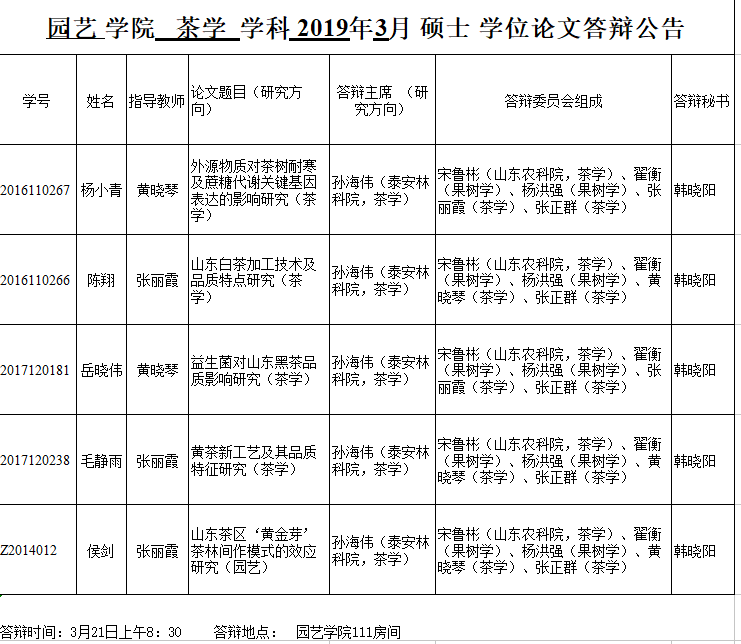 园艺 学院 茶学 学科 2019年3月 硕士 学位论文答辩公告