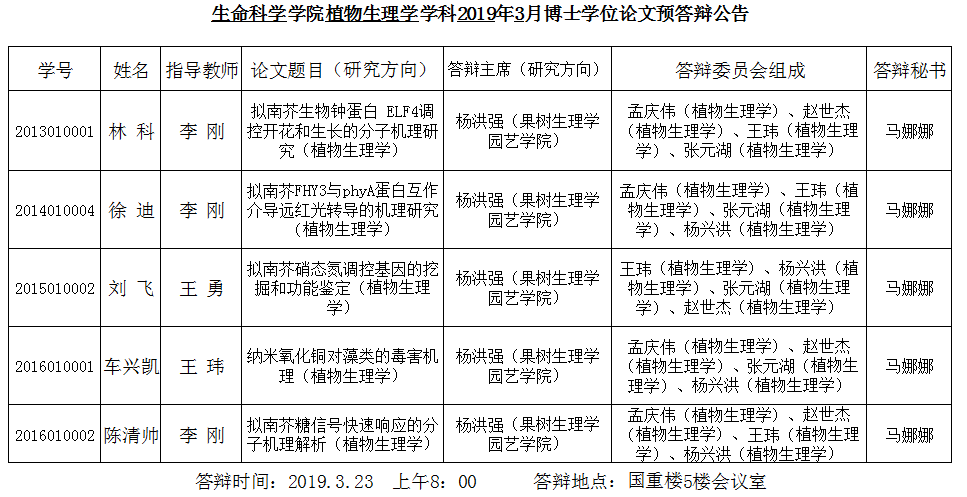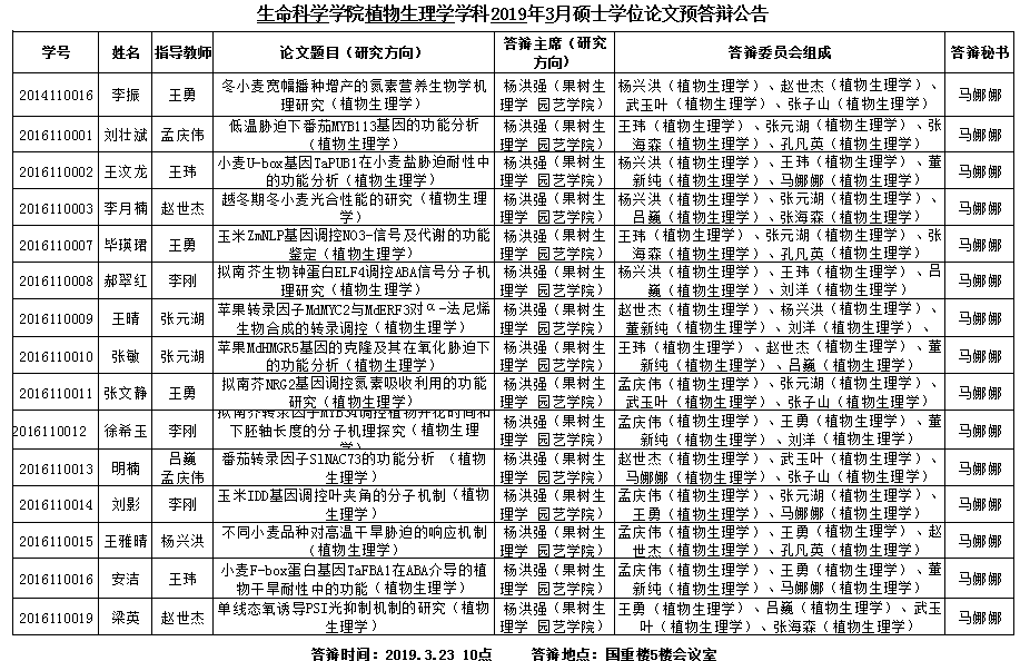 生命科学学院植物生理学学科2019年3月博士、硕士学位论文预答辩公告