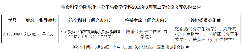 生命科学学院生化与分子生物学学科2019年3月硕士学位论文预答辩公告