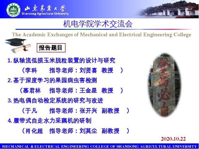 | 机电学院2020年研究生学术汇报(八) | | 学 号 | 姓 名 | 专 业 | 博/硕 | 指导教师 | 报告题目 | 报告地点 | 报告时间 | | 2019120052 | 李科 | 机械工程 | 硕 | 刘贤喜 | 纵轴流低损玉米脱粒装置的设计与研究 | 8号楼423 | 2020.10.22 | | 2019110085 | 慕君林 | 机械工程 | 硕 | 王金星 | 基于深度学习的果园病虫害检测 | 8号楼423 | 2020.10.22 | | 2019120055 | 于凡 | 机械工程 | 硕 | 张开兴 | 热电偶自动检定系统的研究与改进 | 8号楼423 | 2020.10.22 | | 2019120057 | 肖化超 | 机械工程 | 硕 | 刘莫尘 | 履带式自走水力采藕机的研制 | 8号楼423 | 2020.10.22 |