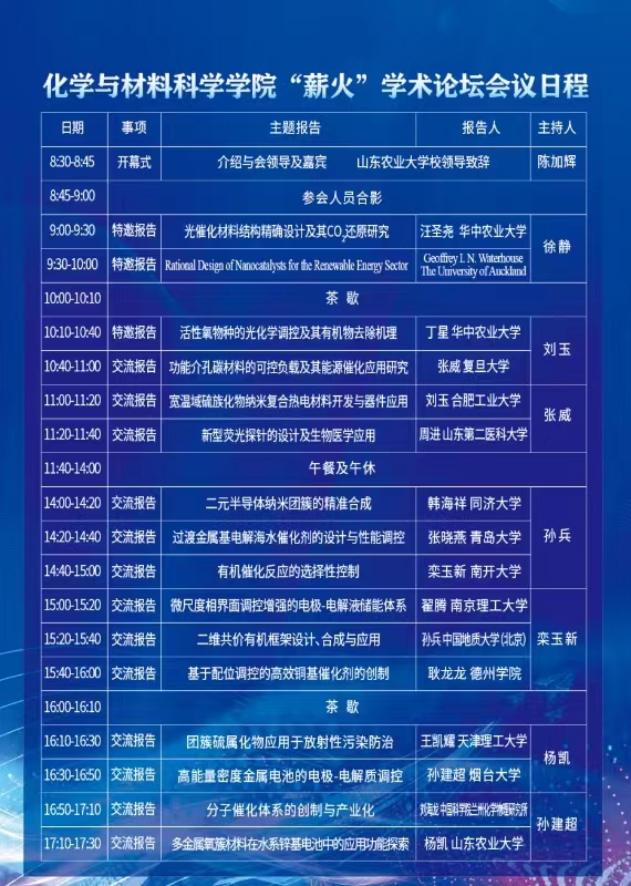 为进一步凝聚校友力量,加强校友交流共进,发挥优秀校友引领作用,助推山东农业大学“冲一流”建设,山东农业大学化学与材料科学学院于2024年4月26日-28日在泰安举办“薪火”学术论坛,围绕化学在新材料、新能源、生命科学、医药、环境和农业等领域的交叉融合和最新研究成果进行学术交流。