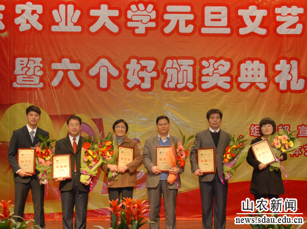 节目中间的“六个好”颁奖典礼一次次把晚会的热烈氛围推向高潮。第二届“身边的感动――六个好”评选活动,是围绕我校创先争优、争做科教兴农先锋而开展的一项重要活动。在创先争优活动中,各基层党委高度重视,广大党员积极参与,奋发向上,求真创新,涌现出一大批优秀团队和个人,此次受到表彰的“六个好”就是他们中的优秀代表。“身边的感动――六个好”评选活动得到全校师生的热烈响应,大家踊跃投票,推荐身边的榜样。经过网络投票、现场投票,最后,泰山学者孔令让教授获得好党员称号、外国语学院学生张敏获得好团员称号、植保学院李向东教授获好教师称号、体艺学院学生黄帅获好学生称号、经管学院办公室副主任王园林获好职工称号、农学院退休教授孙兰珍获好长辈称号。另外54名正式候选人获得提名奖。校领导依次走上主席台,向获奖者颁奖、祝贺,合影留念。