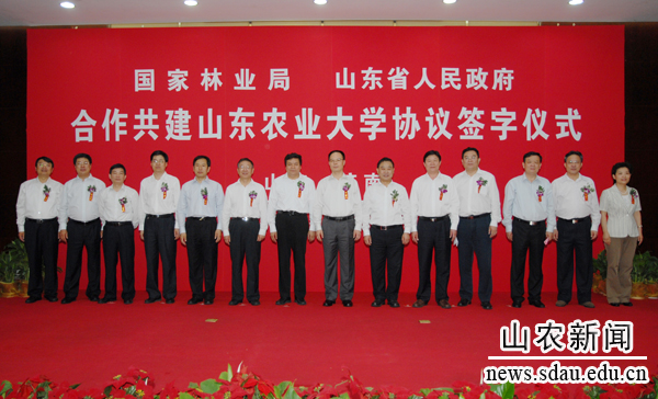 5月7日,国家林业局和山东省人民政府合作共建山东农业大学签字仪式在山东大厦举行,国家林业局局长、党组书记赵树丛,副局长张建龙,山东省委常委、副省长孙伟,副省长贾万志,省发改委、省科技厅、省财政厅、省教育厅、省高校工委、省林业局等省直有关部门负责人,我校党委书记邢善萍、校长温孚江、副校长董树亭、张宪省、纪委书记董新胜率有关学院、部门负责人参加。