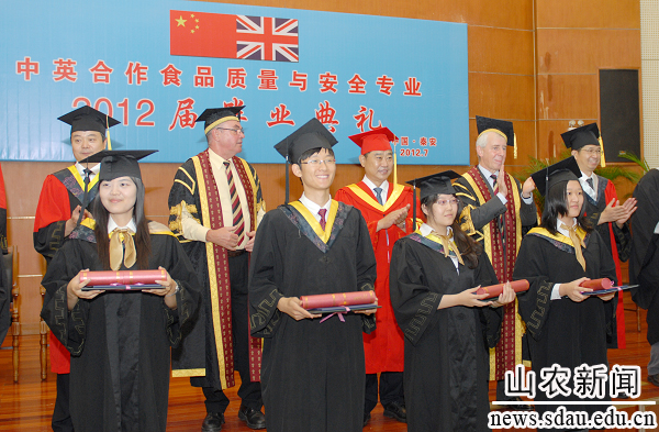 出席毕业典礼的嘉宾为每位毕业生颁发毕业证书,向他们顺利完成学业表示祝贺。据了解,2012届中英合作食品质量与安全专业共有毕业生134人,其中考取国内研究生49人,出国读研18人,考取国家公务员1人,省公务员、事业编4人,签约就业48人。