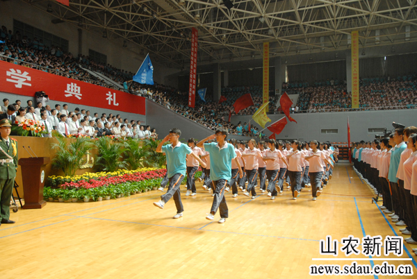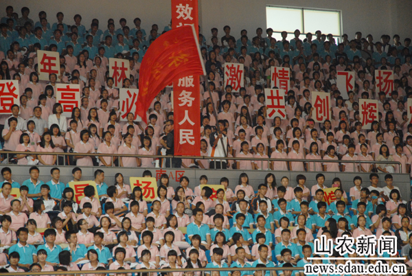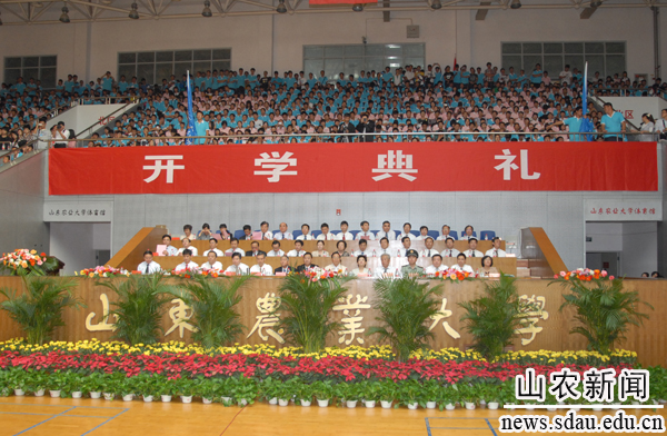 9月14日,南校区体育馆里彩旗飘舞,歌声飞扬,洋溢着热烈欢快的气氛,山东农业大学2012级新生开学典礼在这里隆重举行。