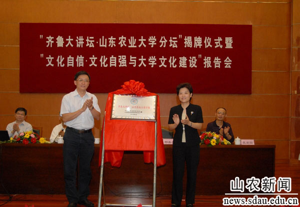 9月27日,“齐鲁大讲坛・山东农业大学分坛”揭牌仪式暨大学文化建设报告会在文理大楼学术报告厅举行,省社科联副主席薛庆国和学校党委书记邢善萍共同为“齐鲁大讲坛・山东农业大学分坛”揭牌,北京大学马克思主义学院党委书记、博士生导师孙熙国教授作首场报告《文化自觉、文化自信、文化自强与大学文化建设》。省社科联科普部副部长高玉宝,泰安市社科联主席袁爱国、副主席夏昕,我校领导张敬和、孙永华、董新胜等出席揭牌仪式。