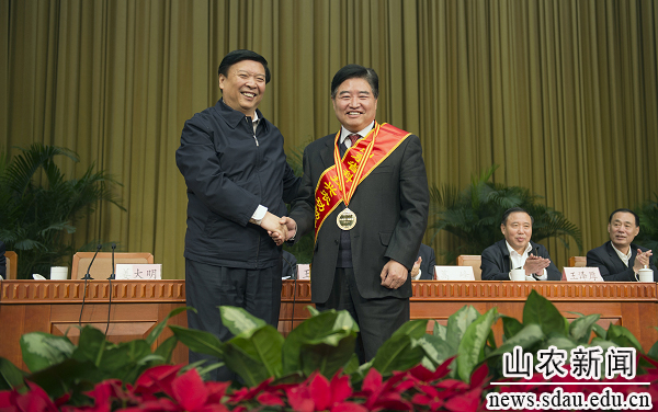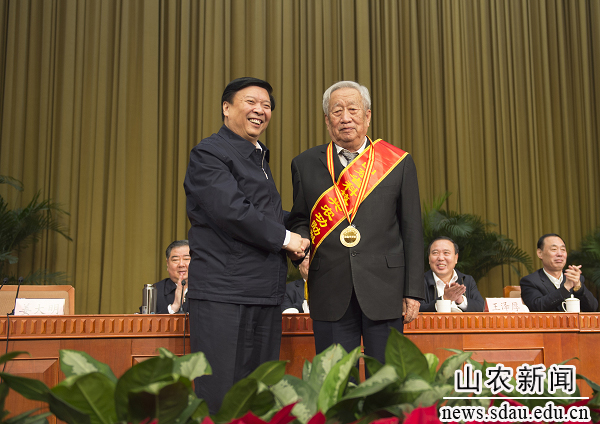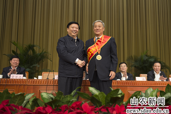 11月6日上午,全省科技兴农大会在济南举行。会上隆重表彰了科技兴农先进集体和先进个人。包括我校束怀瑞院士、于振文院士、董树亭教授在内的八位科学家荣获“科技兴农功勋科学家”称号。姜大明省长为获奖科学家授金质奖牌。