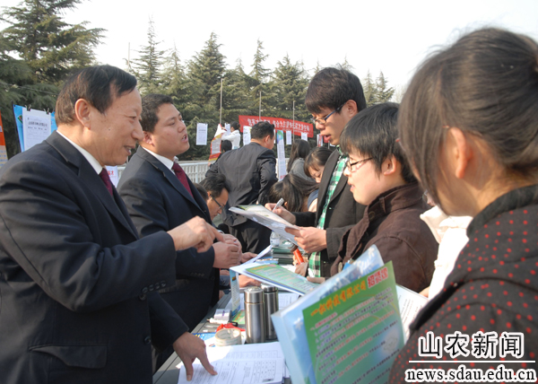3月9日,山东省2013年农林水类毕业生就业市场在南校区举行,来自全省17个地市及北京、上海、浙江、广东、新疆等18个省市的917家用人单位到会招聘毕业生,提供工作岗位2.6万余个,供需比达1:3.5,再创历史新高。