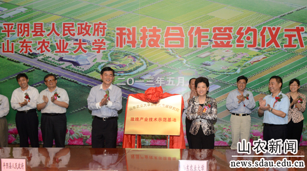 温孚江与朱云生代表山东农业大学和平阴县政府签署科技合作框架协议。主要合作形式有科技项目合作、人才智力合作、技术指导和培训、机构设施联建,重点合作领域在农业新品种选育及其配套技术研究、畜禽良种选育及健康养殖与疫病防控、农林畜产品精深加工、农林生物质及畜禽粪便综合开发利用、生物资源保护与农林生态安全、农业资源高效利用与节水农业、现代农业装备技术。