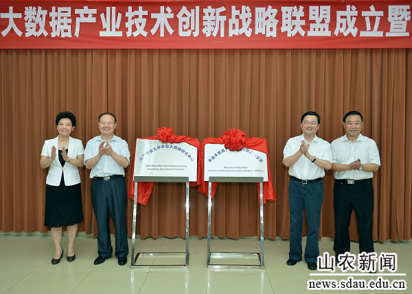 来自山东省科技厅、教育厅、农业厅、林业厅、国土资源厅、水利厅、省畜牧局、农机局的领导,中国测绘科学研究院、山东省农科院、山东农业大学、青岛农业大学等科研单位和高校的领导,以及龙信数据(北京)有限公司、浪潮集团、山东金正大生态工程股份有限公司、山东登海种业股份有限公司等十几家国内知名企业的负责人出席了成立仪式。山东省科技厅厅长刘为民,农业大数据产业技术创新战略联盟理事长、山东农业大学校长温孚江共同为“农业大数据产业技术创新战略联盟”揭牌;山东省教育厅副厅长郭建磊、山东农业大学党委书记邢善萍为“山东农业大学农业大数据研究中心”揭牌。