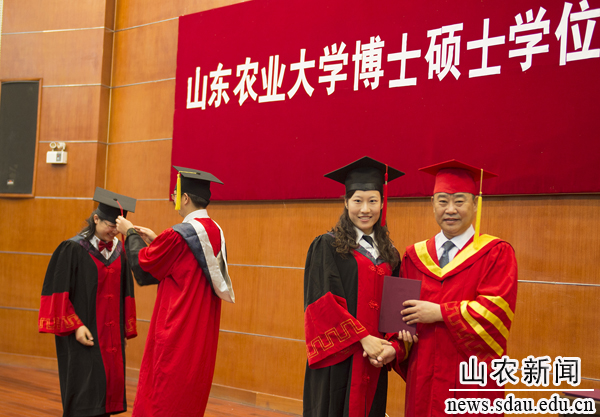 6月20日,山东农业大学隆重举行2013届博士、硕士学位授予仪式,各学院教授委员会主任出席仪式,校领导温孚江、张宪省为995位博士、硕士学位获得者亲手拨过学位帽流苏,颁发证书授予学位并合影留念。