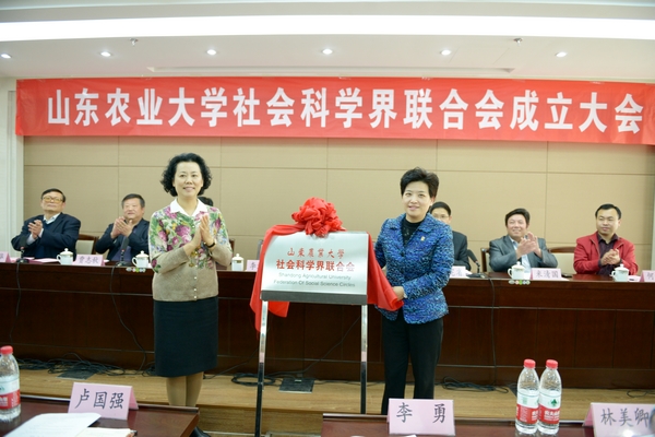 3月27日,山东农业大学成立社会科学界联合会,学校党委书记邢善萍当选理事会主席,副校长张宪省当选副主席。省社科联副主席李海萍,泰安市委常委、宣传部长张志华,泰安市社科联主席贾志秋等到会祝贺。李海萍和邢善萍为山东农业大学社会科学界联合会揭牌。