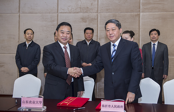 4月29日,山东农业大学与临沂市人民政府农业科技创新战略合作签约仪式在临沂举行。校党委书记邢善萍,校长温孚江,副校长张宪省,临沂市委书记、市人大常委会主任林峰海,市委副书记、市长张术平,市委常委、副市长尹长友,市委常委、秘书长李沂明出席仪式。