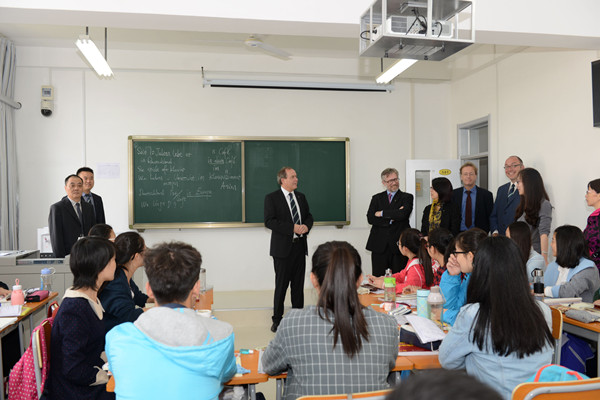 座谈会结束,白潇乐一行走进国交学院教室,与正在学习德语的学生进行交流,勉励他们学好德语,为专业学习打下基础,他会在德国等着大家。