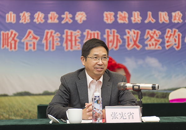 张宪省在签约仪式上致辞。他首先代表全校师生向菏泽市委市政府、郓城县委县政府多年来对山东农大给予的支持表示感谢。他说,山东农大有雄厚的科研实力,有能力为郓城的农业现代化发展搞好服务。山东农大十分重视校地科技合作,长期以来学校与郓城有良好的合作关系。希望今后校地双方进一步加大合作力度。党的十九大提出要实施振兴乡村战略,山东农大有责任有义务让科技成果在包括郓城在内的广大农村开花结果,为服务“三农”作出贡献。希望我们的专家教授在实践中要及时发现问题、研究问题,不断提升服务产业发展的水平。