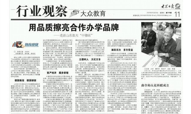 10月26日,《大众日报》以“用品质擦亮合作办学品牌”为题,详细报道了山东农业大学十五年来始终坚持以提升品质为核心,多措并举、持之以恒、久久为功,打造了“中德班”靓丽品牌的经验做法。文章占据了近三分之一个版面,分为德国教授、德国课堂;宽严相济、服务管理;立德树人、又红又专;激发活力、多方受益等四个部分,全方位展现了我校中外合作办学的教学体系、管理模式和发展前景。