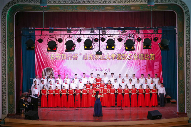 在全校师生深入学习贯彻党的十九大精神,沿着学校第七次党代会确定的目标任务,撸起袖子加油干,为创建高水平大学而不懈努力的时刻,由校工会主办的“唱响新时代‘泰安银行杯’山东农业大学教职工合唱比赛”决赛,于12月19日晚在北校区大礼堂隆重举行。校领导张宪省、朱莉、嵇景涛、张明志、吴衍涛、张然、司金贵,泰安银行副行长李成山等出席此次活动。
