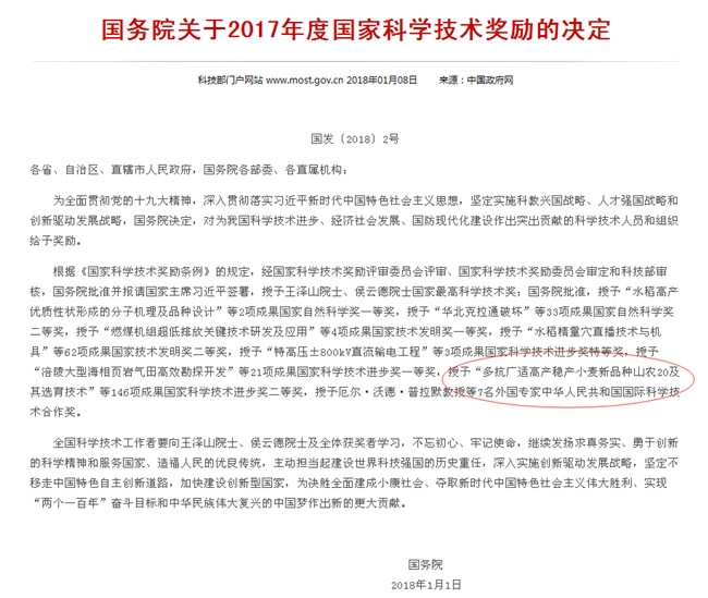据悉,2017年度国家最高科学技术奖授予王泽山院士、侯云德院士。35项成果获国家自然科学奖,其中一等奖2项、二等奖33项;66项成果获国家技术发明奖,其中一等奖4项、二等奖62项;170项成果获国家科学技术进步奖,其中特等奖3项、一等奖21项、二等奖146项;7名外籍专家获中华人民共和国国际科学技术合作奖。