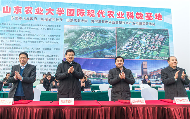 1月19日,山东农业大学、山东省黄河三角洲农业高新技术产业示范区管委会、东营市人民政府、山东省科技厅在东营签署共建山东农业大学国际现代农业科教基地合作协议,并举行科教基地建设推进会。