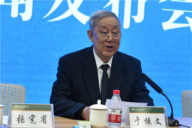 发布会最后,于振文院士发布了由刘观浦、王平、黄有惠主编,山东人民出版社出版发行的《齐鲁时代楷模余松烈》一书。2016年4月,中国小麦栽培学奠基人、中国工程院院士、山东农业大学教授余松烈先生逝世。作为余院士的学生,于振文院士通过发布新书来表达对老师的缅怀和追忆。他说,余松烈院士为中国小麦生产发展做出了重要贡献,为国家培养了大批农业科技人才,他是我们学生心目中最敬重和爱戴恩师。于振文希望读者阅读《齐鲁时代楷模余松烈》一书,缅怀余老师科教兴农业绩的同时,学习和传承他热爱祖国、热爱人民、对工作忘我投入、无私奉献的革命精神,严谨求实、不断进取、开拓创新的思想风范。