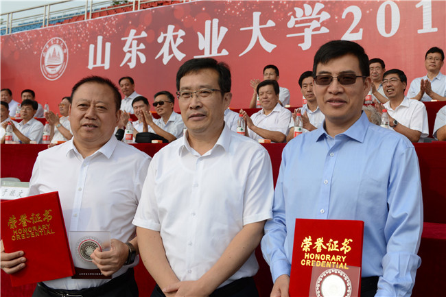 党委书记徐剑波为山东农业大学第七届杰出校友颁奖。1982级林学专业校友、光合新兴产业控股集团股份有限公司董事长王明荣,1989级畜牧专业校友、同济大学生命科学与技术学院院长高绍荣,1990级农业机械设计制造专业校友、中国农业大学研究中心主任李道亮获杰出校友称号。