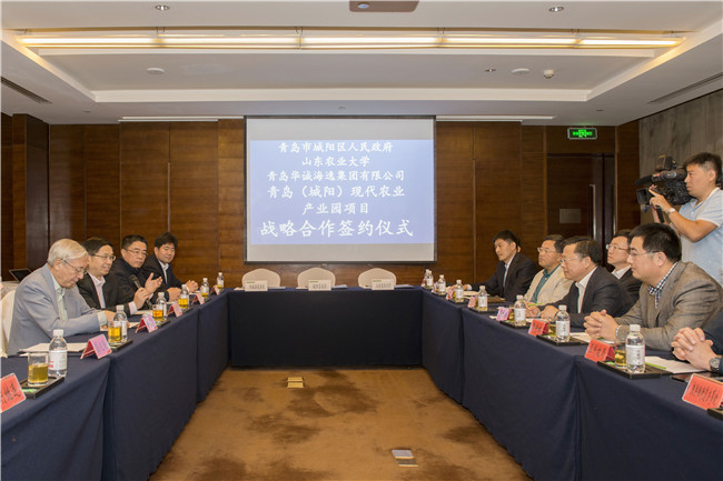 10月17日,山东农业大学与青岛城阳区和华诚海逸集团,就现代农业产业园项目签署战略合作备忘录,山东农业大学校长张宪省、城阳区人民政府区长李红兵、华诚海逸集团董事长赵良涛等出席签约仪式。中国科学院院士、北京大学现代农学院院长许智宏应邀出席。