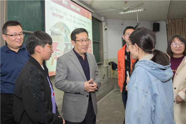 徐剑波称赞李波的授课准备充分,非常精彩,同学们听得很专注,课堂秩序动静有序。他说,讲授习近平新时代中国特色社会主义思想,就必须结合中国实际,客观讲述中国国情与国力。老师只有精心准备,在知识的广度、厚度和新颖性上多用心,讲得精彩,事例生动,交流轻松,学生的兴趣才能调动起来。李波说,这些年来,学校在激励青年教师站好讲台方面出台了很多政策,学院也积极引导教师时刻关注世界大事、中外动态,用心总结中国建设成就,研究历史与文化,只有这样,才能让学生从碎片化的信息包围中把知识系统起来,形成正确的思想观念。