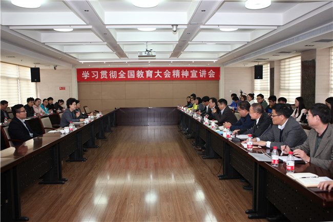 邢善萍指出,要全面加强党的领导和党的建设,扎实做好学校思想政治工作和意识形态工作,实施新时代立德树人工程,着力在六个方面“下功夫”,加强新时代教师队伍建设,深化教育领域综合改革,提升教育服务经济社会发展能力,确保全国教育大会精神落地生根、开花结果。