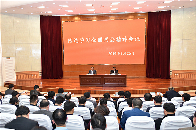 张宪省传达了第十三届全国人大第二次会议精神和全国政协第十三届二次会议的有关精神,介绍了大会概况和会议的主要精神,委员们关注的热点和重点问题,解读了习近平总书记重要指示、重要讲话、重要观点,分析政府工作报告亮点和要求以及外商投资法等会议的主要精神等。他还介绍了山东省代表团的主要活动和工作情况,分享了自己履职尽责的体会。