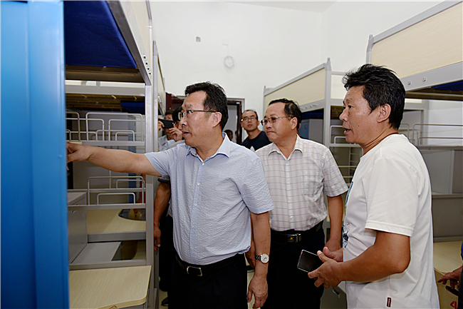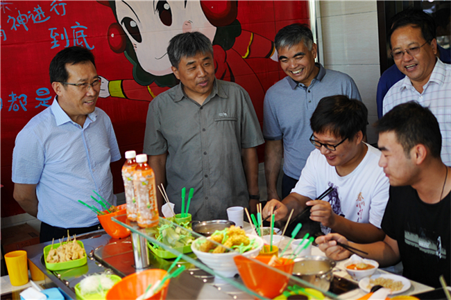 徐剑波对东南片区完善的配套设施表示满意。他说,教室内宽敞明亮,有先进的多媒体设备、崭新的桌椅,让教师教学、学生学习更加方便;学生宿舍每个房间内都配有阳台、卫生间、空调,床和衣柜美观且安全,楼内还建了公共浴室,整体装修效果非常好,宽敞明亮,让人感到温馨舒适。在刚刚投入使用的学生餐厅内,徐剑波一行来到每个窗口查看饭菜花样,向工作人员询问饭菜价格等,叮嘱他们一定要为学生提供良好的服务,同时还与餐厅内就餐学生亲切交流,了解他们的用餐感受。
