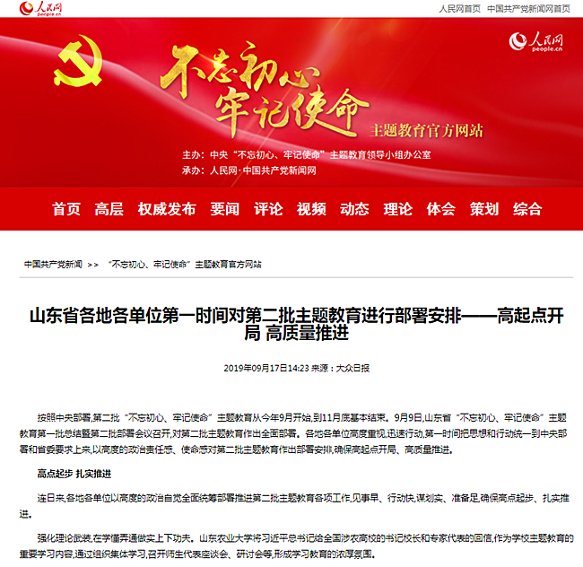 9月7日,山东省教育厅“山东教育发布”刊发了学校师生学习习近平总书记回信的感想体会。9月17日,大众日报在头版重要位置刊发题为《山东省各地各单位第一时间对第二批主题教育进行部署安排——高起点开局高质量推进》文章,引用我校学习教育工作典型做法,点赞学校“强化理论武装,在学懂弄通做实上下功夫”。同日,由中央“不忘初心、牢记使命”主题教育领导小组办公室主办,人民网、中国共产党新闻网承办的主题教育官方网站对文章进行了转载。9月19日,党委书记徐剑波、校长张宪省在黑龙江七星农场参加了新农科建设北大仓行动工作研讨会,同全国50余所涉农高校参会人员一起,集中学习习近平总书记回信精神,共同提出深化高等农林教育改革行动实施方案,提出新农科建设“北大仓行动”,部署为新农科建设建好“实验田”。