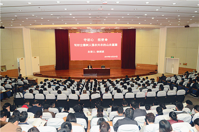 10月29日下午,按照学校“不忘初心、牢记使命”专题党课的总体安排,党委书记徐剑波以《守初心、担使命,写好立德树人、强农兴农的山农篇章》为题,为学校师生代表讲授党课。