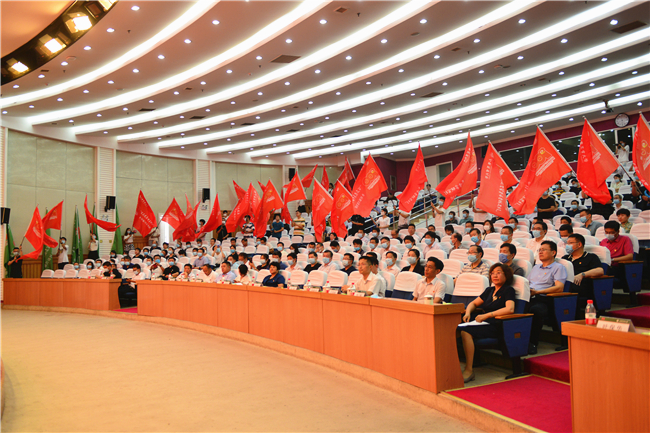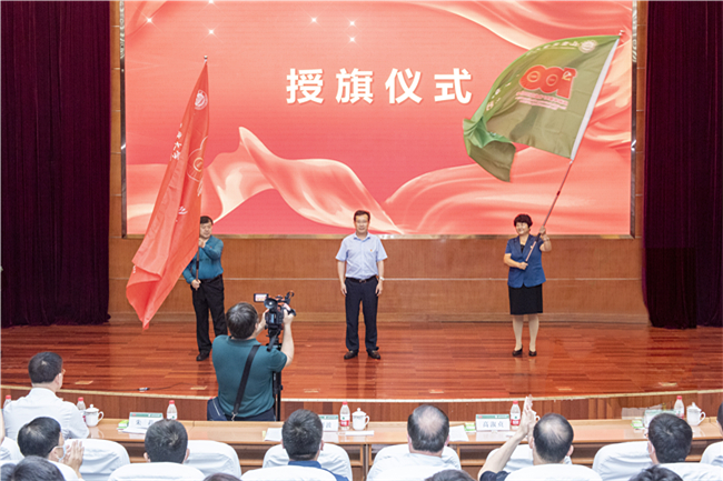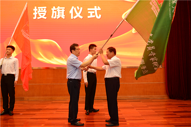 山东农业大学党委书记徐剑波为联系村党支部书记代表和服务团专家代表授旗,感谢联系村为学校师生提供广阔实践舞台、成果转化舞台,勉励服务团师生做伟大建党精神的弘扬者,牢记习近平总书记重要嘱托,践行党的宗旨,扛起时代重任,把农民群众利益作为开展活动的出发点和落脚点,不断创新服务“三农”的模式方法,帮助联系村解决生产生活中的实际问题,让农民得到实实在在的实惠;做强农兴农使命的践行者,坚定献身“三农”的人生志向,广泛调查国情社情,体察民声民意,紧紧围绕国家战略需求,主动对接农业创新发展、乡村一二三产业融合发展和现代职业农民素养发展新要求,攻坚克难、开拓进取,更好地服务国家粮食安全、农业绿色生产和生态可持续发展,把最好的论文写在希望的田野上;做为民办事的示范者,紧密结合工作岗位和乡村实际,紧扣群众期待、聚焦群众诉求,勇挑最难最重的担子,多下抓小抓细的功夫,为群众办实事、办好事、解难事,为基层留下一大批看得见、摸得着的成果,与农民、与企业建立长期密切的联系,继续为实现人民对美好生活的向往不懈努力,努力为党和人民争取更大光荣。