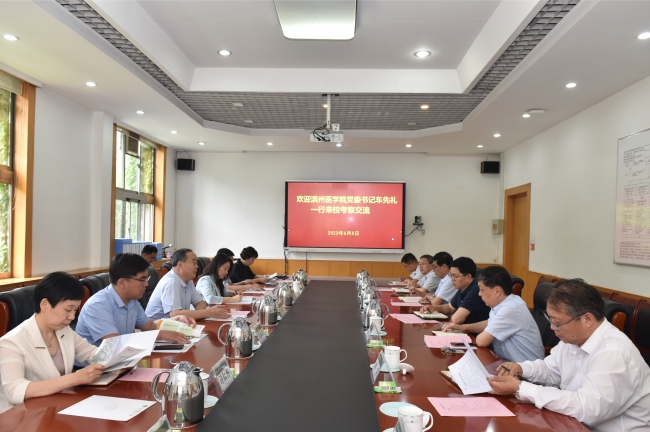 6月5日,滨州医学院党委书记车先礼一行来访,学校党委书记徐剑波会见车先礼一行,党委副书记、校长冷畅俭与客人座谈,并就学科建设、科学研究、学生工作以及校地合作等进行深入交流。副校长林海参加活动。