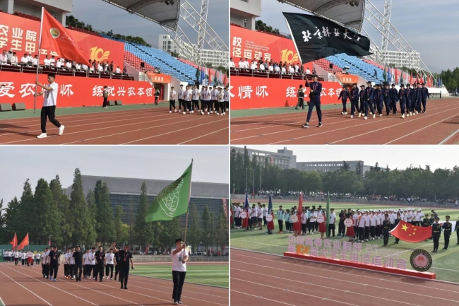 在激昂的运动员进行曲中,36支代表队高举队旗,按照运动会报名顺序依次入场,展示青春风姿和学校风貌,山东农业大学代表队作为东道主最后入场。