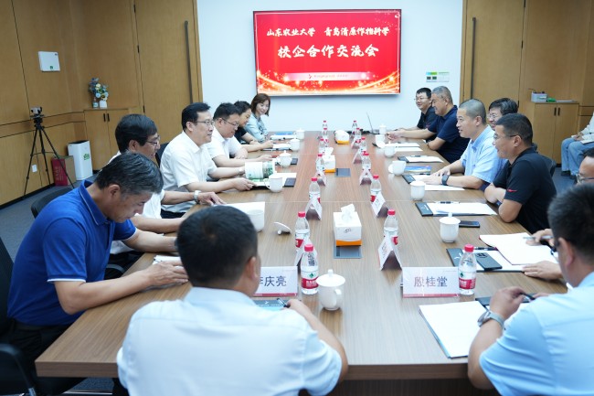在青岛清原作物科学公司,徐剑波走进公司展馆、组培室、温室大棚,详细了解该公司在新农药创制、生物技术性状开发和商业化育种等方面的建设发展情况。座谈会上,徐剑波对企业的目标愿景、研发团队建设以及取得的科研成就给予高度评价,对校企双方的合作成果给予充分肯定。得知公司董事长连磊、总经理庄润青以及多名高管、多数员工均为学校校友,徐剑波非常高兴,他向与会人员介绍学校深厚办学底蕴和最新发展成就,并就小麦产业研究院、现代设施农业产业研究院以及学校“冲一流”建设等方面的情况进行了深入交流。连磊介绍公司总体情况、发展规划,他感谢学校多年来的悉心培养和对公司发展的支持帮助,希望进一步密切与学校的联系与合作,在推动公司发展的同时,努力为一流农业大学建设贡献力量。